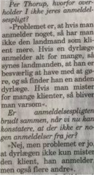 »Problemet er, at hvis man anmelder noget, så har man ikke den landmand som klient mere. Hvis en dyrlæge anmelder alt for mange, så synes landmanden, at han er besværlig at have med at gøre, og så finder han en anden dyrlæge. Hvis man mister for mange klienter, så bliver man varsom«.